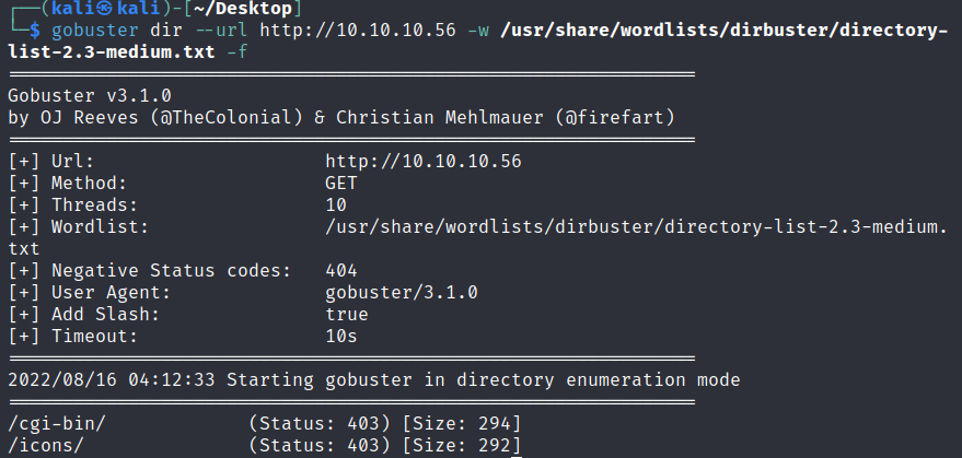 使用gobuster扫描一下网站目录:goburster dir --url http://10.10.10.56 -w /usr/share/wordlists/dirbuster/directory-list-2.3-medium.txt -f