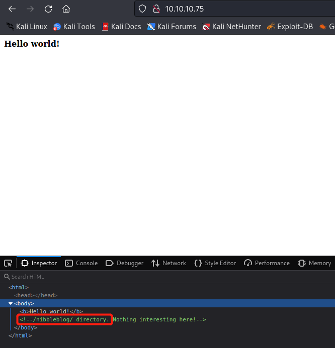 只有一个Hello world,看到下面有个注释,有个nibbleblog目录,进去看看