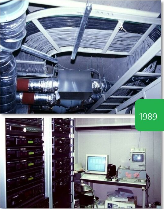 桌子下面的电脑运行的是 BTRON OS(在前面有标志。还有其他计算机来控制设备。左边是 AV 信号分配设备的机架。