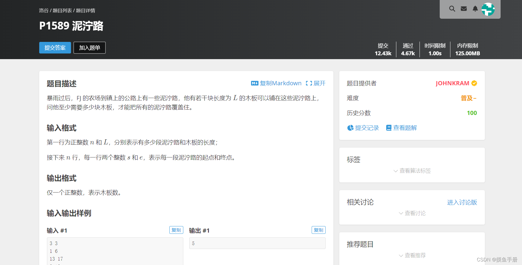 思路: 一道比较明显的贪心题目。覆盖路A的木板可能也会覆盖路B的部分长度,那在计算路B所需要的木板数量的时候,就不需要从起点开始铺。