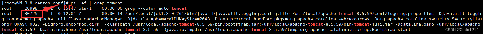 以tomcat为例,可以看到tomcat是在正常运行的状态,他的PID是38725最后面那一长串是和它运行相关的指令。