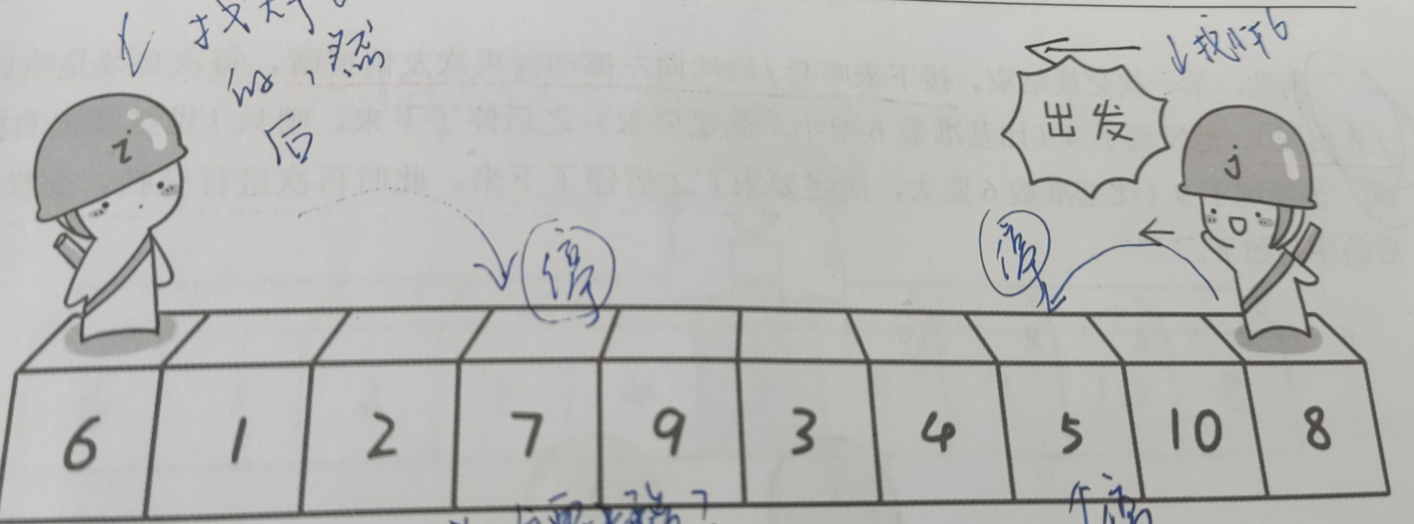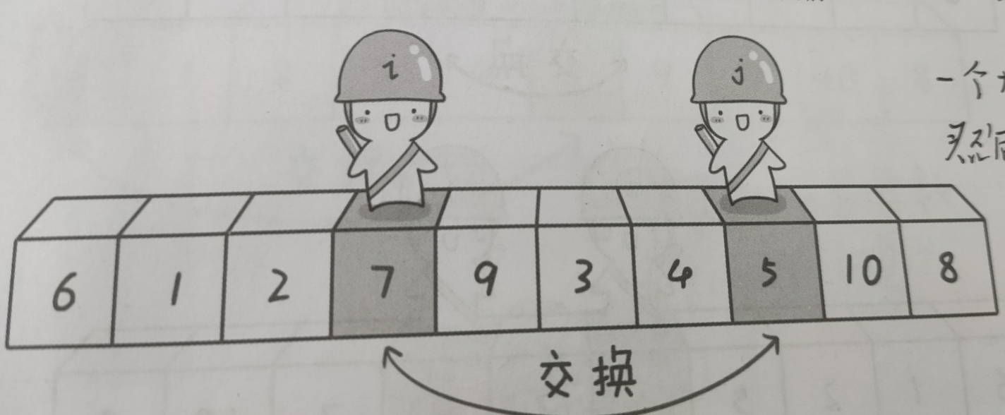 基准数的数然后停下来,接着阮阮再走,找到一个大于基准数的数然后停下来,接着就将两个人的位置交换,交换完之后,两个人继续往前走,知