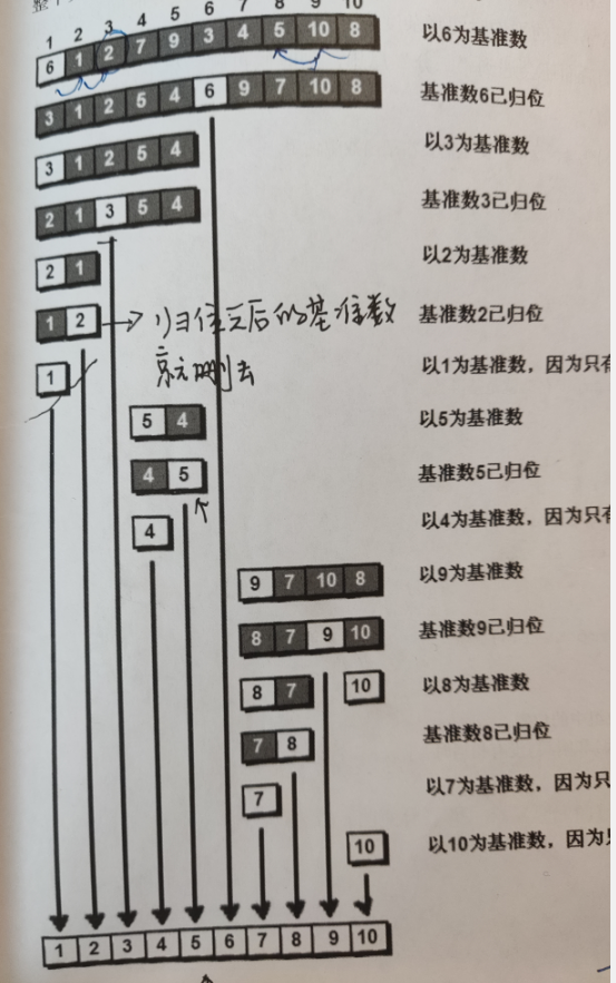 假设现在对10个数来进行排序6 1 2 7 9 3 4 5 10 8。首先我们要先确定一个基准数,为了方便呢我们就假设第一个数是基准数,现在双向来遍历这个数组,右边先开始遍历(后面会说原因这里很重要),右边往左走的过程中遇到小于基准数的数停下来,然后左边开始往前走,遇到大于基准数的地方停下来,然后将两个位置交换,随后两边继续往后走,直到两者相遇。