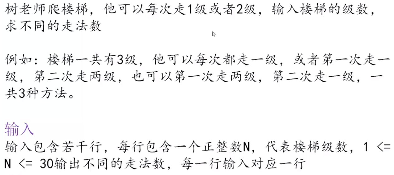 #include <iostream> using namespace std; int n; int stairs(int n){ if(n<0){ return 0; } if(n == 0){ return 1; } return stairs(n-1)+stairs(n-2); } int main(){ while(cin>>n){ cout<<stairs(n)<<endl; } }