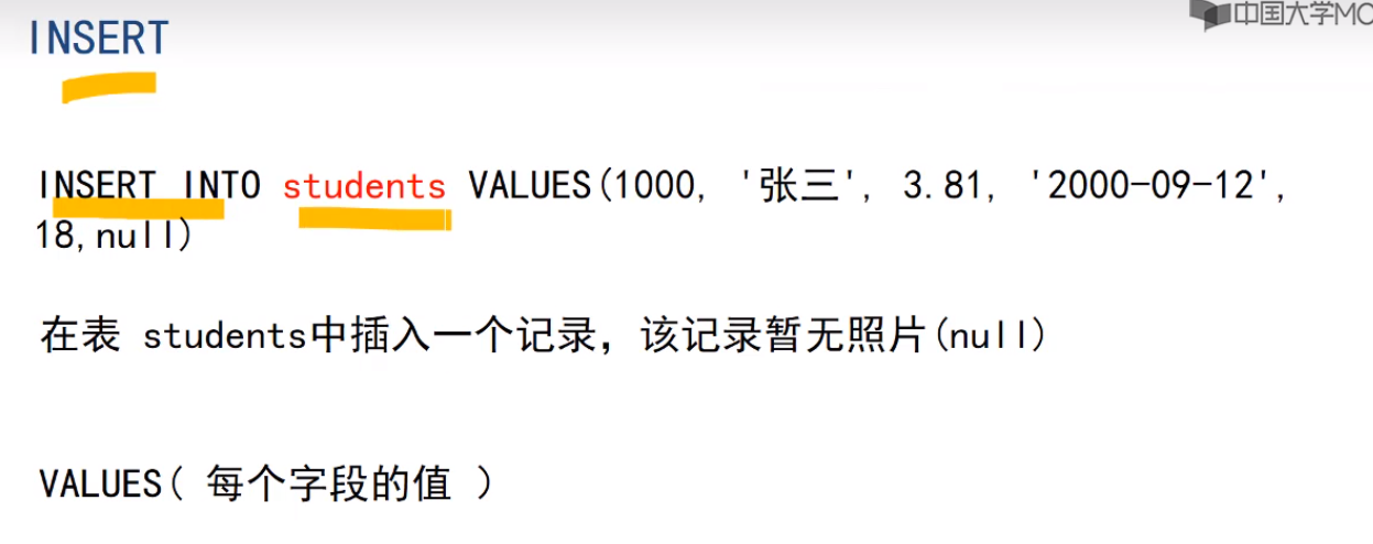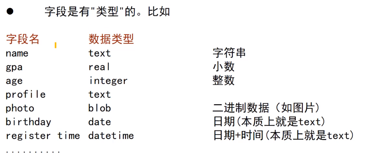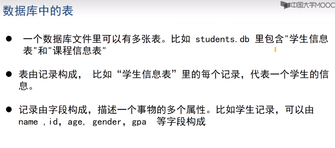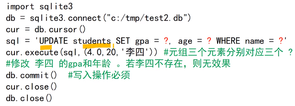 import sqlite3 db = sqlite3.connect("c:/tmp/test.db") #连接数据库,若不存在则自动创建 cur = db.cursor() #获取光标,操作数据库全部都要考光标实现 sql = "GREATE TABLE if not exists student (id integer primary key, name,text,gpa real,birthday date,age integer,picture blob)" #如果students不存在的话 就创建一个表 cur.execute(sql) cur.execute("insert into students value(1600,'张三',3.81,’2000-09-12‘,18,null)") mylist = [(1700,'李四',"3.25",'2001-12-01',17,None) (1780,'李五',"3.85",'2001-11-01',17,None)] for s in mylist:#依次插入mylist中的每个记录 cur.execute("insert into students value(?,?,?,?,?,?)",(s[0],s[1],s[2],s[3],s[4],s[5])) db.commit() #真正写入,写入操作都需要这个 cur.close()#关闭光标 db.close()#关闭数据库