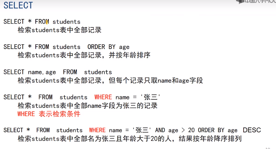 where其实就是像条件,最后一句就是有用and来连接,要按照年龄来排序的话,就要有OLDER BY age