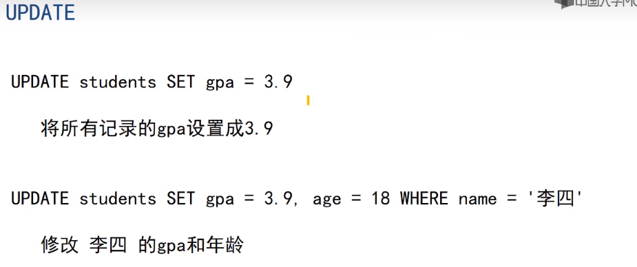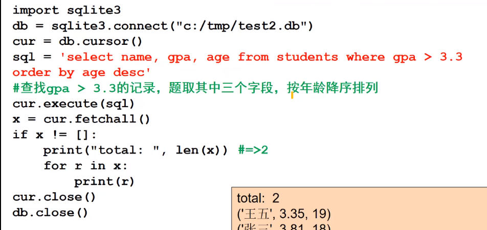 db = sqlite3.connect("c/tmp/text2.db") cur = db.cursor()#打开光标 sql = 'select *from students'#检索所有学生的内容 cur.execute(sql) x = cur.fetchone()#取出满足内容的第一个记录 print(x) print(x[1]) for x in cur.fetchall:#这个函数就是取出全部的记录 print(x[:-1]) cur.execute("SELECT *FROM students WHERE name ='Jack'") x = cur.fetchone() if x == None: print("can not find Jack") cur.close() db.close()