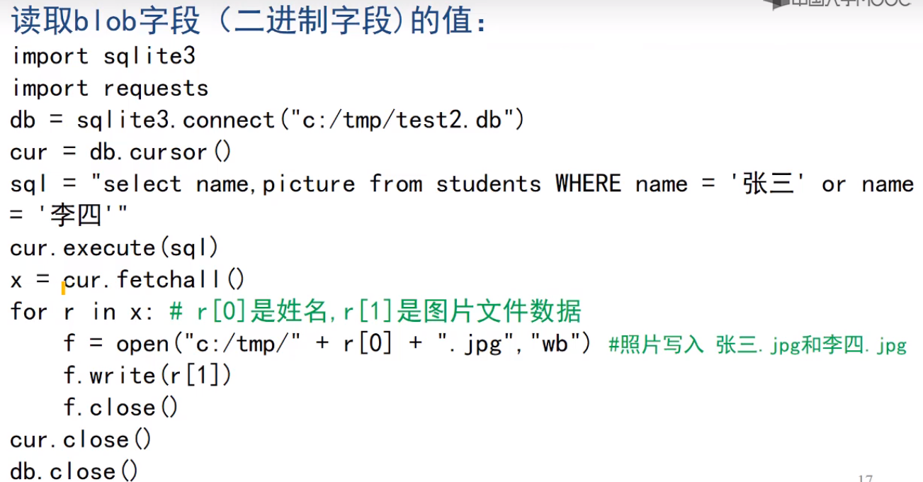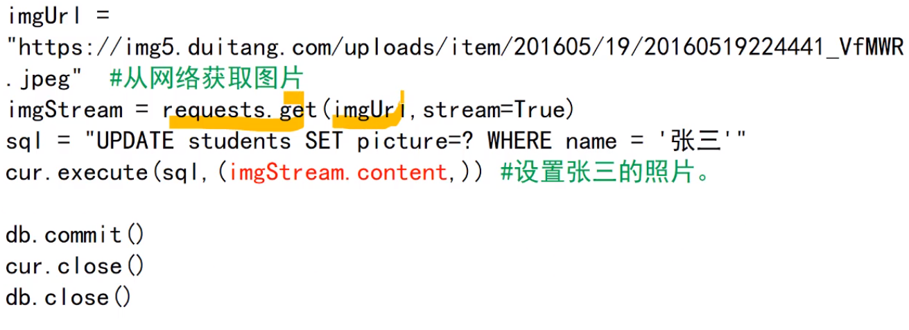 import requests f = open('c:/tmp/tmp.jpg','rb')#打开文件所在地址 img = f.read()#用read把文件读出来 db = sqilte3.connect('c:/tmp/test2.dp') cur = db.cursor() sql = "UPDATA students SET picture=? WHERE name = '李四’" cur.execute(sql,(img,))#把文件用updata set 搞到数据库里面