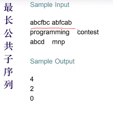 #include <iostream> #include <cstring> #include <algorithm> using namesapce std; char s1[1000]; char s2[1000]; int maxlen[1000][1000]; int main(){ while(cin>>s1>>s2){ int len1 = strlen(s1); int len2 = strlen(s2); int Tmp; int i,j; for(i = 0;i<=len1;i++){ maxlen[i][0] = 0; } for(j = 0;j<=len2;j++){ maxlen[0][j] = 0; } for(i = 1;i<=len1;i++){ for(j = 1;j<=len2;j++){ if(s1[i-1] == s2[j-1]){ maxlen[i][j] = maxlen[i-1][j-1]+1; }else{ maxlen[i][j] = max(maxlen[i-1][j],maxlen[i][j-1]); } } } cout<<maxlen[len1][len2]<<endl; }