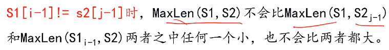 这个要证明的话要使用反证法,首先很显然不会比两者其中一个小,因为字符都多出来了,肯定不可能会小,但是难的是为什么不会比两者都大呢?假设第一个比后面两个都大。MaxLen(s1,s2)比MaxLen(s1,s2j-1)多了一个s1[j-1]如果第一个比第二个大的话,说明s1[j-1]是要起作用的,不然是不会大的。同理s2[i-1]也是要起作用的。所以这两者肯定是位于最长公共子序列里面而且是最后一个字符。如果是这样的话就不满足s1[i-1] != s2[j-1].(说实话这个我自己思考完全搞不清楚)