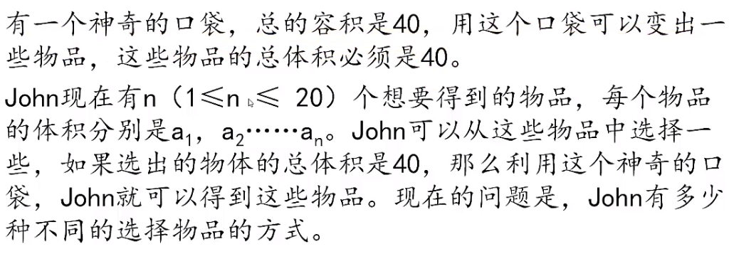 #include <iostream> using namespace std; int a[30], N; int way(int w, int k) { //从k中物品中选择一些,凑成体积w的做法数目 if (w == 0) return 1; if (k <= 0) return 0; return way(w, k - 1) + way(w - a[k], k - 1); //其实就是不选第k个(也就是最后一个物品)的选法加上选第k个的选法 } int main() { cin >> N; for (int i = 1; i <= N; i++) { cin >> a[i]; } cout << way(40, N) << endl; return 0; }