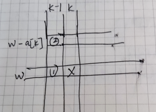 从递归式子里就可以退出这个二维数组,所以如果要退出×这个位置有两种,第一种就是不取第k种(在二维数组的表现就是w-a[k]这个值突上去了),取k种就是w-a[k]的值没有突上去。这个地方在遍历二维数组的时候加上一个判断就好了
