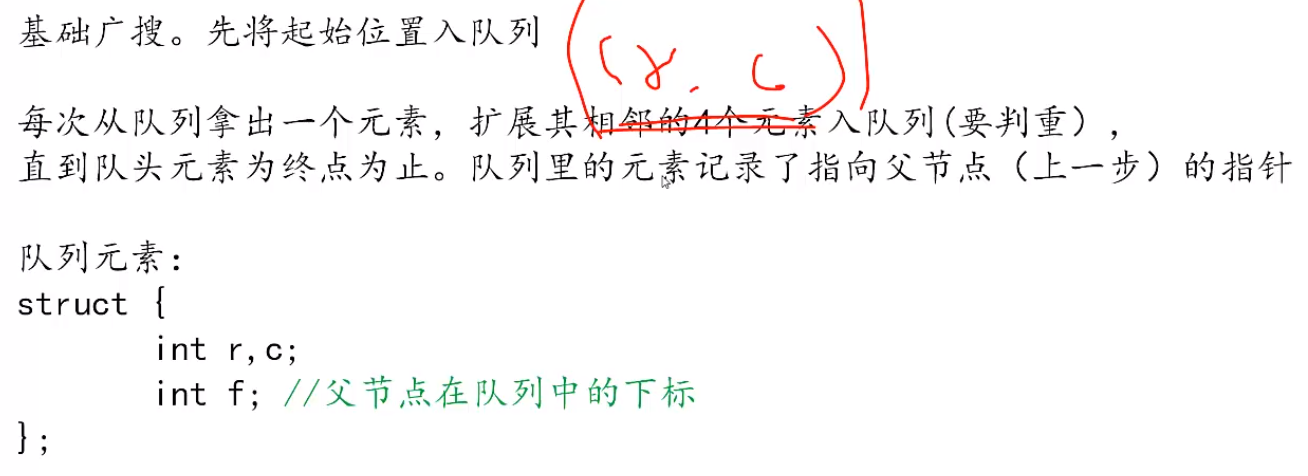 这里再添加一下对迷宫问题的思考:首先把起点的父节点设置为-1,这个就为后面的递归寻找路径的停止条件做了铺垫。在广搜的过程中,先将队头元素出队,判断出队元素是否是要找大元素,判断边界,判断是否走过,判断在地图中能不能走,如果没问题的话,就把元素入队并标记。最后让head++。