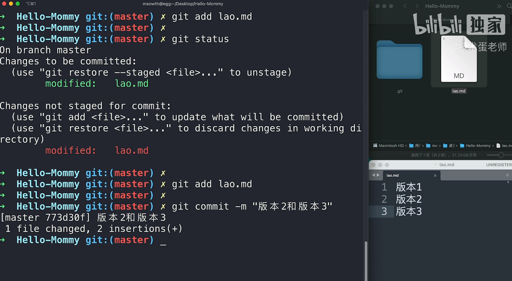 如图 蛋老师在lao.md中新添加了版本2,接着使用git add lao.md将版本2更新后的文件添加到了缓存区