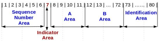 COBOL 源代码依赖于列,这意味着列规则是严格执行的。每个 COBOL 源代码行都有五个区域,其中每个区域都有一个开始列和结束列。