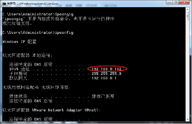 - 打开cmd窗口,输入ipconfig查看本机局域网地址