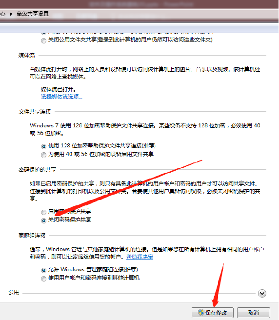 往下翻,关闭密码保护共享,保存修改。