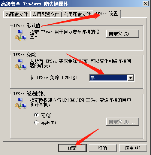 - 点击windows防火墙属性->IPSec设置->IPSec免除 修改为是