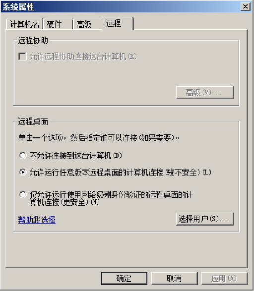 - 在远程桌面一栏中勾选“允许运行任意版本远程桌面的计算机连接(较不安全)”