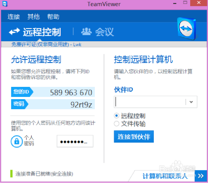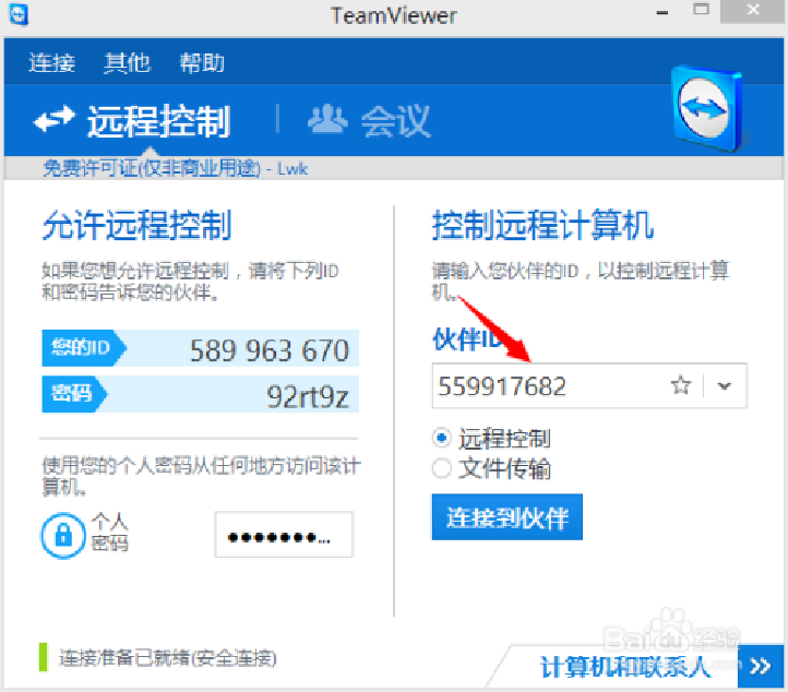 在伙伴的IP号框中输入对方的ID号,然后点击连接到伙伴。