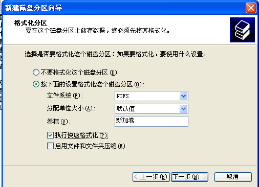 一直点下一步到这个界面,勾选执行快速格式化,点击下一步