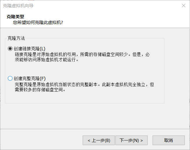 创建链接克隆:克隆出来的新的虚拟机占用空间小,但是他的功能和原来的虚拟机没有任何区别,唯一的缺点就是:如果你的原来的虚拟机删了,这个克隆出来的虚拟机也就不能用了