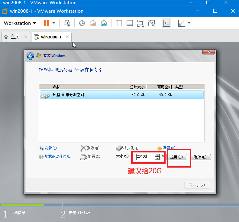 4、步骤:驱动器选项(高级)-- 新建-- 大小:20480 -- 应用