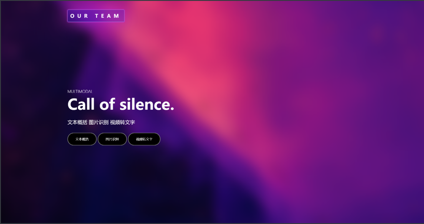 | 组名、项目简介 | 组名:Call of Silence 项目需求:设计出一个交互友好的多源异构数据的采集与融合的小应用 项目目标:通过在web端输入文本、图片、视频等多源数据进行内容提取并对其进行概括 技术路线:前端3件套(html、css、js)、flask、 |