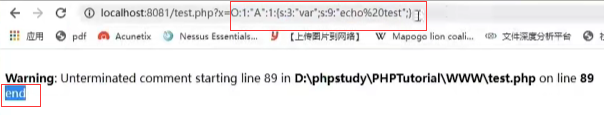 访问的时候,将X参数传参为字符串 O:1:"A":1:{s:3:"var";s:9:"echo test";} ,结果 __destruct()方法被执行了(对象被销毁)