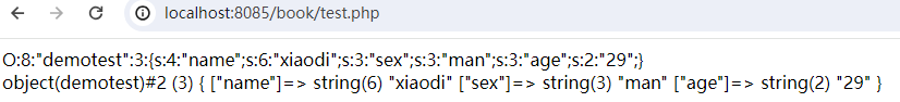 输出的值:O:8:"demotest":3:{s:4:"name";s:6:"xiaodi";s:3:"sex";s:3:"man";s:3:"age";i:29;} //如果变量类型是int类型i,就不会显示长度
