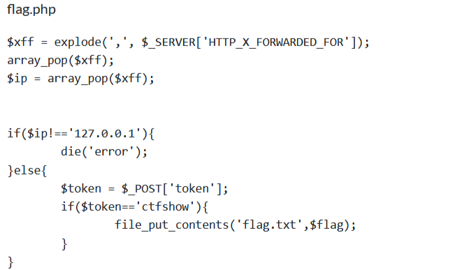 flag.php获取flag条件是 ip地址要为127.0.0.1,并且token=ctfshow才能进行写入到flag.txt