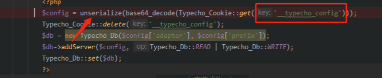 ① 全局搜索序列化函数关键字:unserialize,在install.php第232行获取了 ‘_typecho_config’ Cookie信息后未进行过滤直接进行反序列操作,导致这个入口点可以直接进行反序列化攻击。