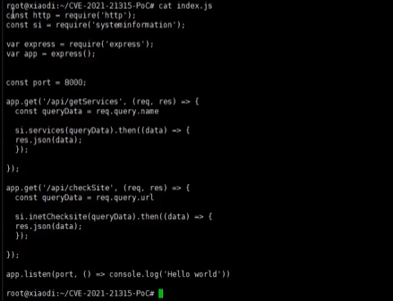 Node.js-systeminformation是用于获取各种系统信息的Node.js模块,在存在命令注入漏洞的版本中,攻击者可以通过未过滤的参数中注入payload执行系统命令。