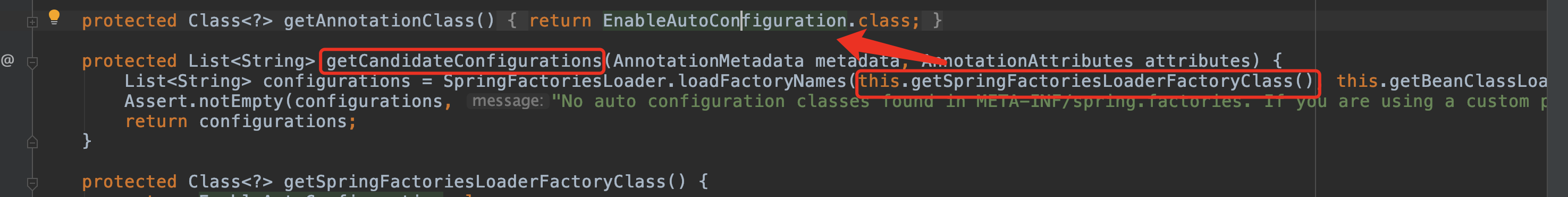 在@SpringBootApplication这个组合注解中,其中有一个@EnableAutoConfiguration注解,显示通过@Import注入AutoConfigurationImportSelector.class,该class中通过getCandidateConfigurations会到classpath下的读取META-INF/spring.factories文件的配置,并返回一个字符串数组。最终这个数组就是spring原生自动装配的组件信息。如下图