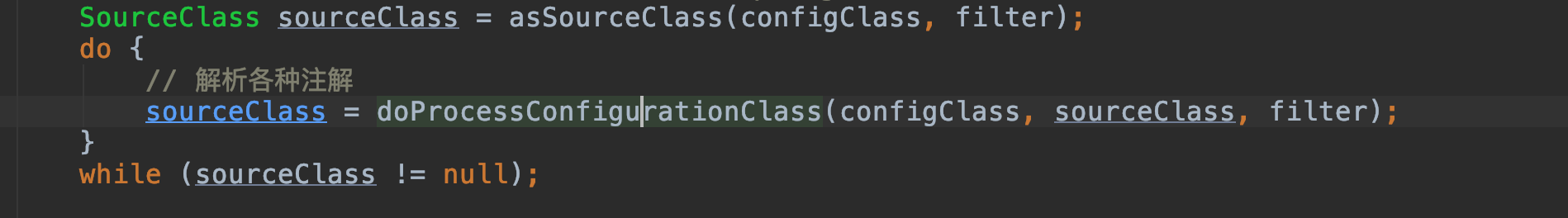 4、最终在processConfigurationClass中doProcessConfigurationClass解析各种注解