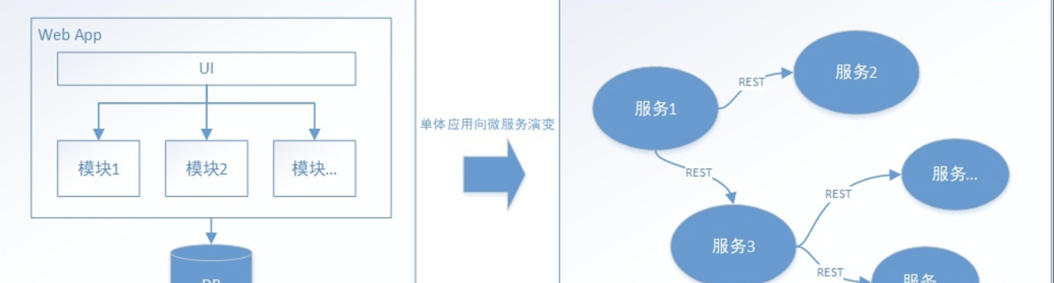 随着互联网的快速发展,软件系统由原来的单体应用转变为分布式应用,下图描述了单体应用向微服务的演变: