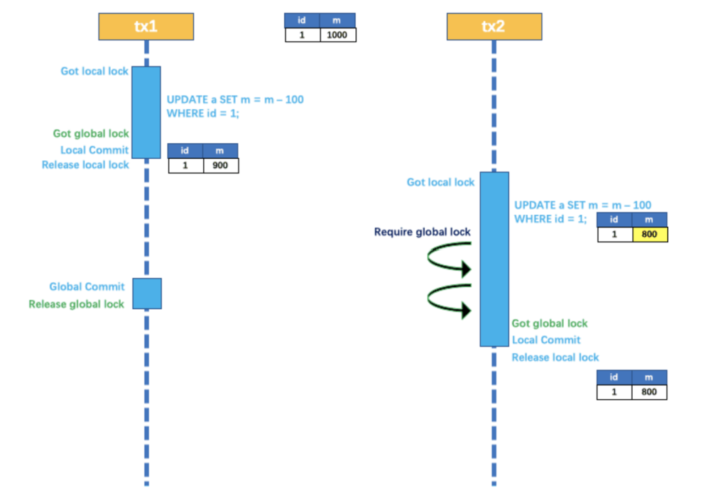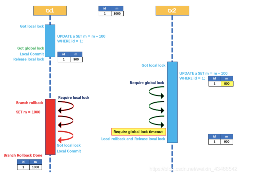 1.TM 向 TC 申请开启一个全局事务,TC 创建全局事务后返回全局唯一的 XID,XID 会在全局事务的上下文中传播;