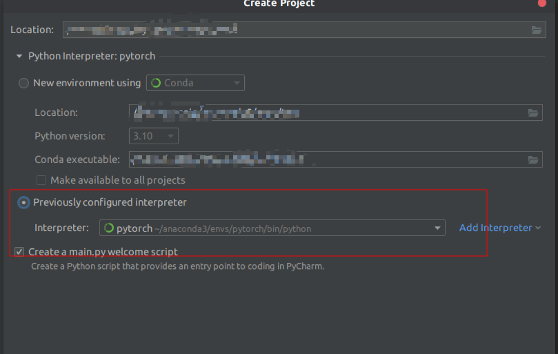 - 打开pycharm,新建项目,使用之前创建的环境,也可以先随便创建后在设置里改