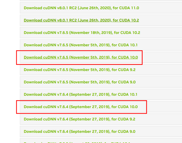 - 进入官网下载cudnn,需要注册登录才能下载,找到与cuda10.0对应的版本,这两个应该都可以