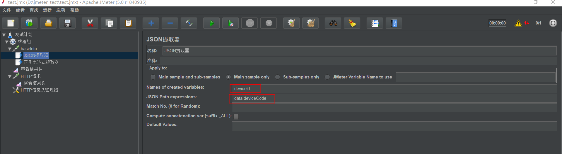 对接口A添加 后置处理器>JSON提取器,设置变量名deviceId,变量取值data.deviceCode