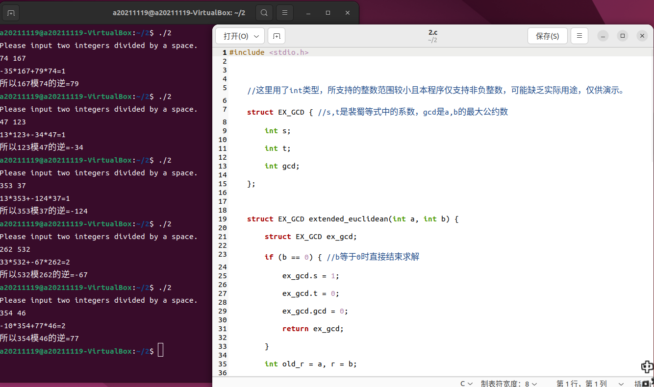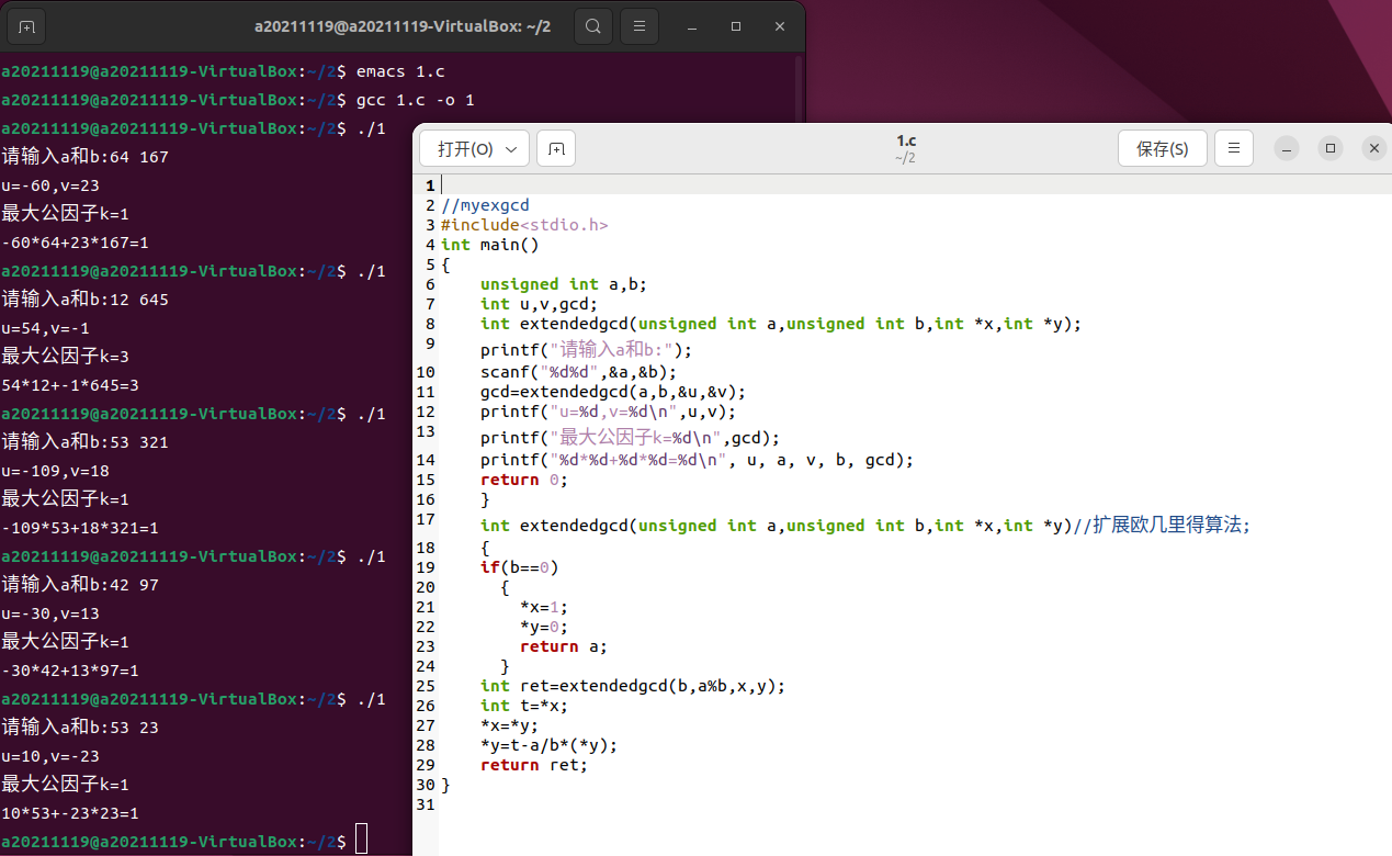 - 严格按照《密码工程》p112伪代码实现ExtendedGCD(int a, int b, int *k, int *u, int *v)算法(10')
