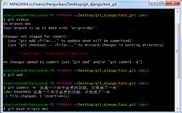 然后分别跳到自己的分支上去开发自己对应的功能,分别将自己的功能提交,但是我们的功能只完成了一半,接下来我们回去继续提交,全部提交完成之后再次提交