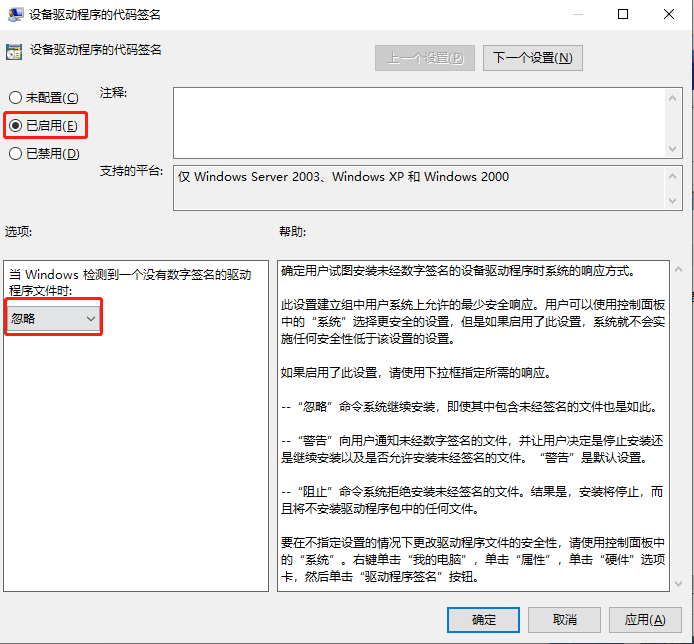 4. 双击设备驱动程序的代码签名,选择已启用及忽略